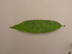 Őszibarack levél klorotikus rajzolatok (Dr. Némethy felvétele)
