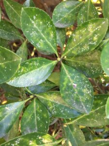Hím (fehér) pajzstetvek és szívogatási sárga foltok a leveleken