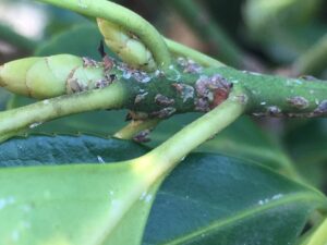 Telelésre vonult nőstény pajzstetvek a hajtáson, rügypikkelyen